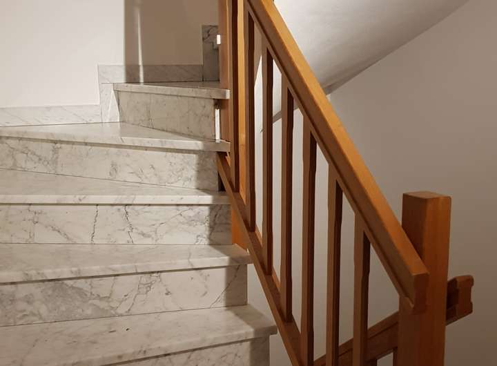 Teilweise bodentiefe Fenster, Fußbodenheizung, Carrara-Marmor auf der Treppe, Bodenfliesen, Laminat-Böden, noch vorhandene Teppichböden werden durch Vinyl-Böden ersetzt. Türen und Treppengeländer in Eiche