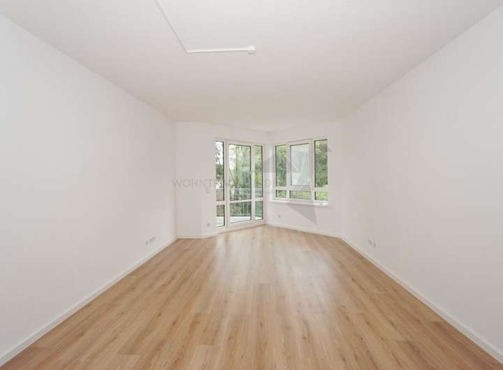 + großes Wohnzimmer mit Balkon und Laminatbodenbelag