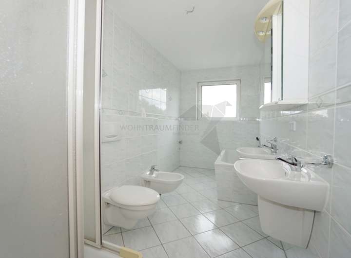 + modern gefliestes Bad mit Wanne, Dusche, Doppelwaschbecken, WC, Bidet und Waschmaschinen-Stellplatz