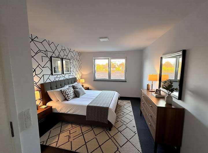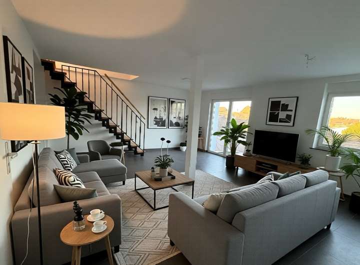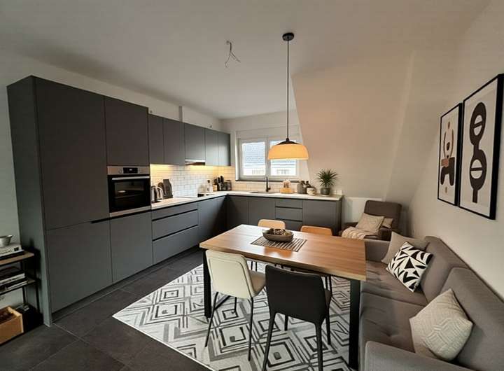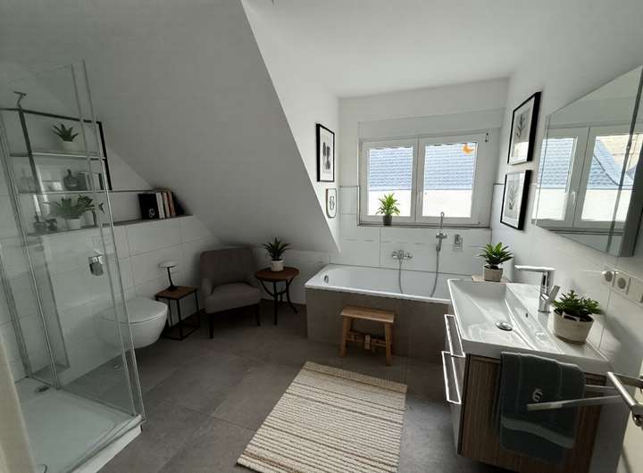 Die Wohnung überzeugt durch einen klaren, modernen Grundriss. Der offene Wohn- und Essbereich mit integrierter Küche schafft eine großzügige Atmosphäre. Der ausgebaute Spitzboden, der direkt vom Wohnzimmer aus zugänglich ist, bietet zusätzlichen Raum – ideal als Arbeits-, Gäste- oder Hobbybereich. Ein sonniger Balkon lädt zum Entspannen ein.