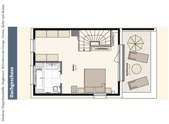 Die Dachterrasse hat eine Fläche von ca. 13qm, die Gartenterrasse hat eine Fläche von ca. 16 qm. Alle 4 Etagen sind mit Fußbodenheizung ausgestattet, die Versorgung erfolgt durch Fernwärme mit eigener PEWO-Übergabestation. Es handelt sich um ein KfW-Effizienzhaus 55 nach EnEV 2014 mit der Verschärfung ab 2016 und kontrollierter Wohnraumlüftung mit Wärmerückgewinnung. Im EG befindet sich der ca. 45 qm große Bereich Wohnen/Essen/Kochen, sowie ein Gäste-Bad mit Dusche. Die glänzend weiße Einbauküche der Marke Häcker Systemat verfügt über Miele Geräte und ein großes Kochfeld mit integrierter Abluft von Bora. Im OG befinden sich 2 Schlafzimmer und das Masterbad mit Regendusche und großer Badewanne. Im DG befindet sich ein Atelier mit ca. 28qm, ein Wannenbad mit ca. 6 qm und eine Dachterrasse mit ca. 13qm. Der Keller hat eine Fläche von ca. 47qm und 2 separate Räume mit Fußbodenheizung und Lichtschächten. Ebenfalls im Keller befindet sich der Hausanschlussraum mit Fernwärme und großem Warmwasserspeicher.