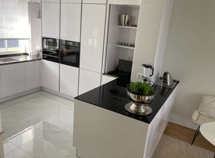 Stumpf einschlagende Innentüren mit verdeckten Bändern, Fabrikat JELD-WEN Optima 30 brilliantweiß. Einbauküche Häcker Systemat polarweiß glänzend grifflos.