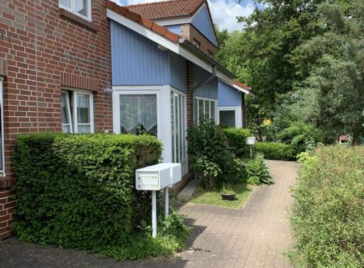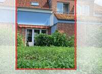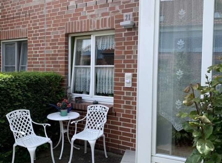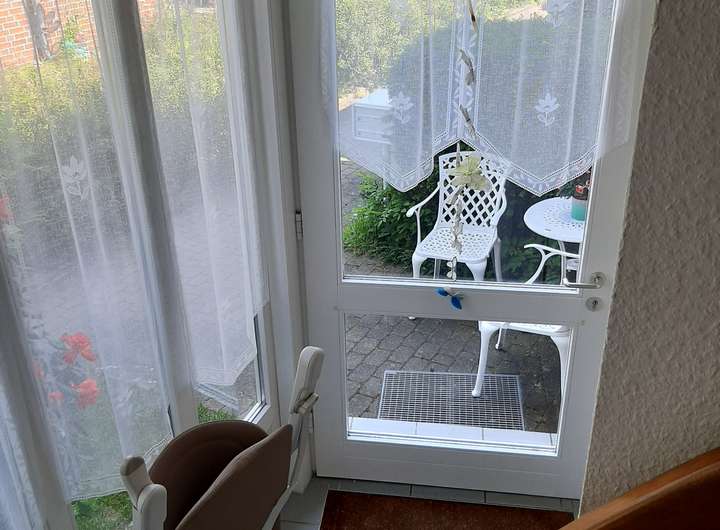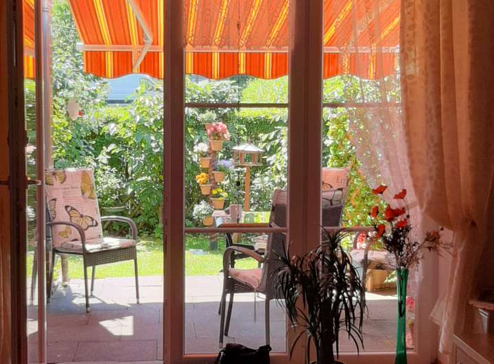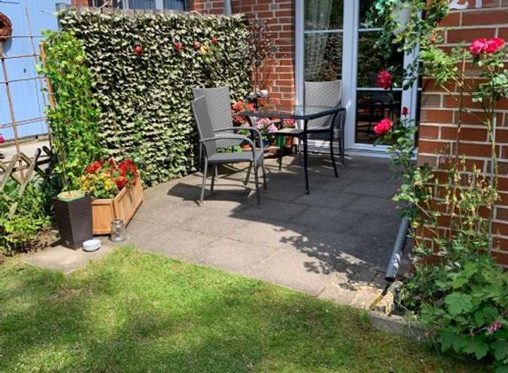 Das Reihenhaus hat eine kleine Terrasse und einen Balkon Richtung Süden, unter dem sich ein Geräteschuppen befindet. Auf der Hauseingangsseite kann man im schattigen Plätzchen Richtung Norden sitzen.