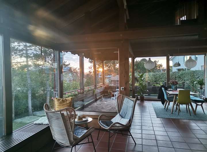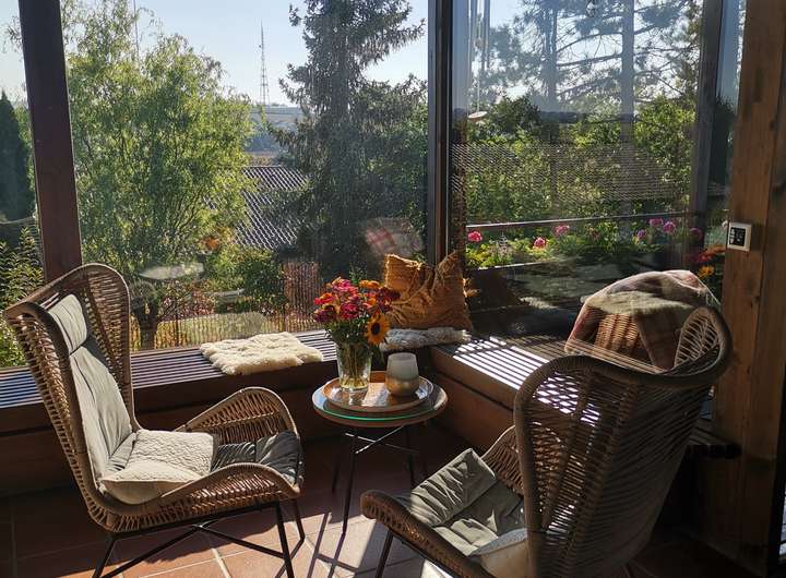 Terracotta-Fliesen, hochwertiger Teppich, Gas-Zentralheizung, Fußbodenheizung, Wintergarten für Pflanzenüberwinterung
