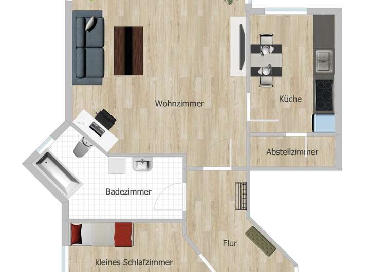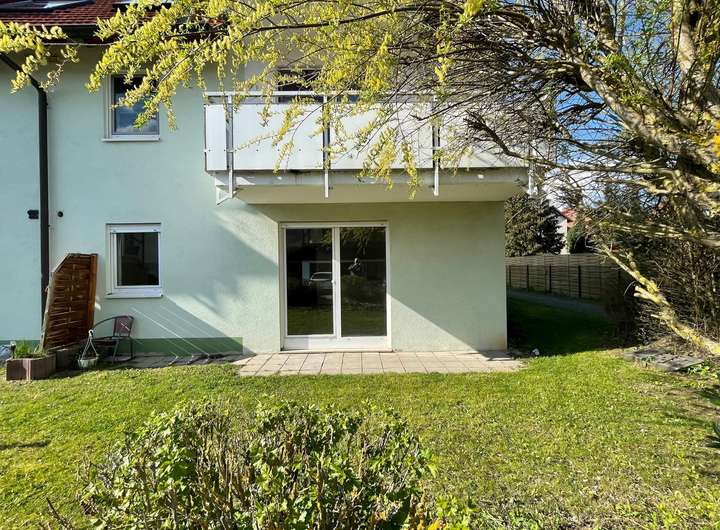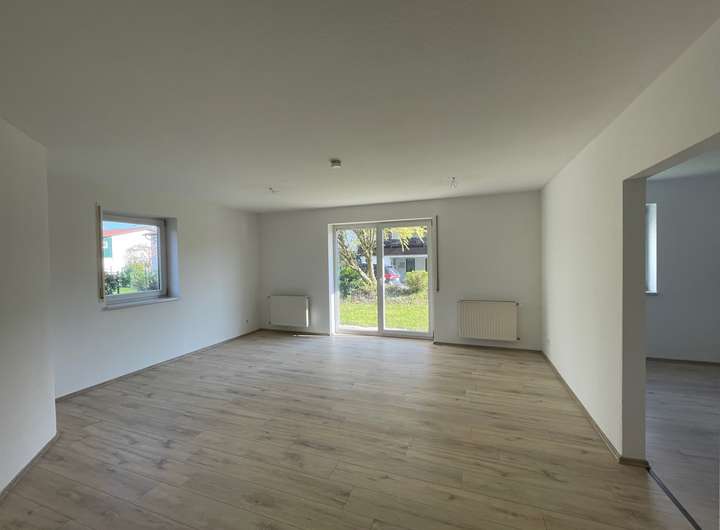 Wohnzimmer mit Terrasse, kleines Schlafzimmer (ca. 9 m²), Bad mit Wanne, Küche mit Abstellraum, Fahrradraum.