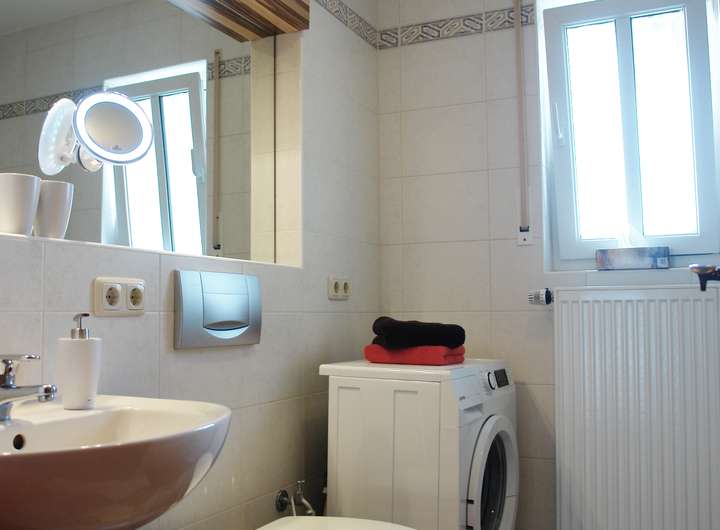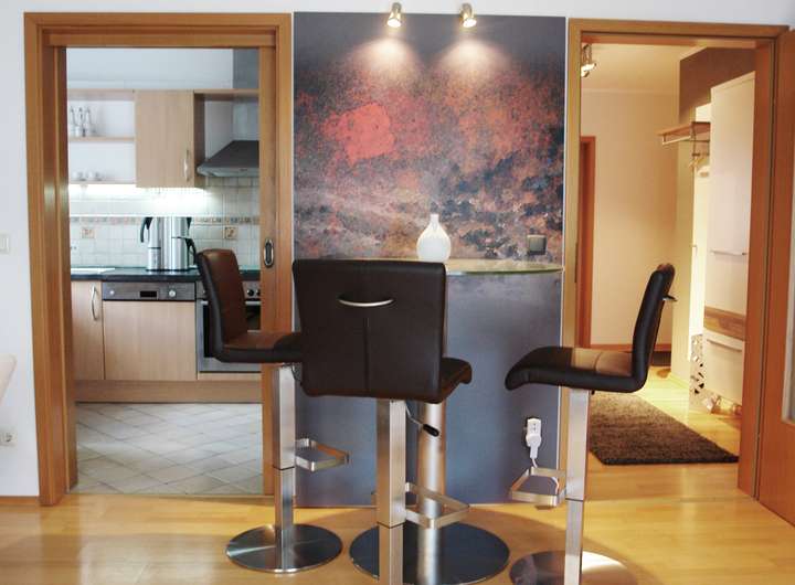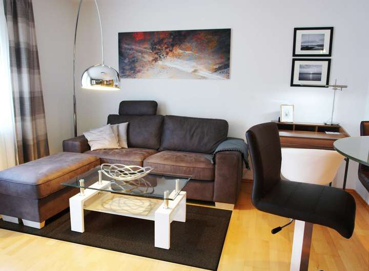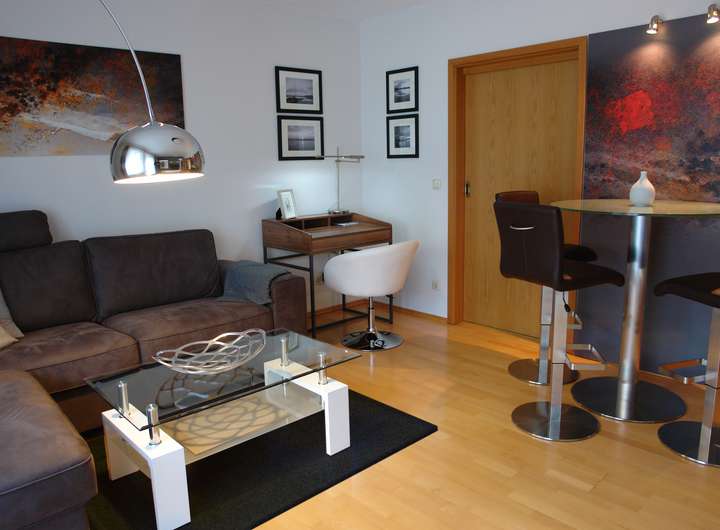 Moderne Möbelierung, Gas-Zentralheizung; voll ausgestattete Küche; Buche-Parkettboden in Diele, Wohn- und Schlafzimmer; Fliesenboden in Küche und Bad; großer Flatscreen-TV im Wohnzimmer; Balkon mit Markise; Bad mit Dusche/Duschkabine und Badewanne; Waschmaschine; Staubsauger uvm.