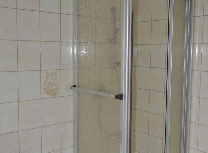 Das geräumige Badezimmer ist mit einer Badewanne, einer Dusche, WC und Waschbecken ausgestattet. Die Fliesen sind beige gehalten.