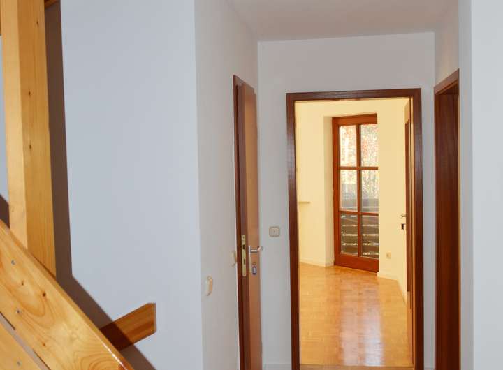 Eine offene Holztreppe führt ins Ober- und Dachgeschoss sowie den Keller.