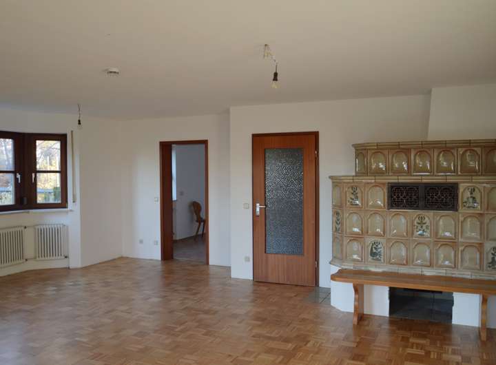 Das geräumige Wohnzimmer hat einen Kachelofen.