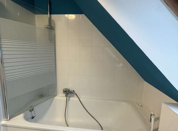 Bad (4m²) mit Wanne und aufgesetzter Duschflügeltür, großer Keramikwaschtisch mit Ablage, Spiegel und WC, Fußboden und Wände (halbhoch) hell gefliest , großes Schrägfenster zum Öffnen.