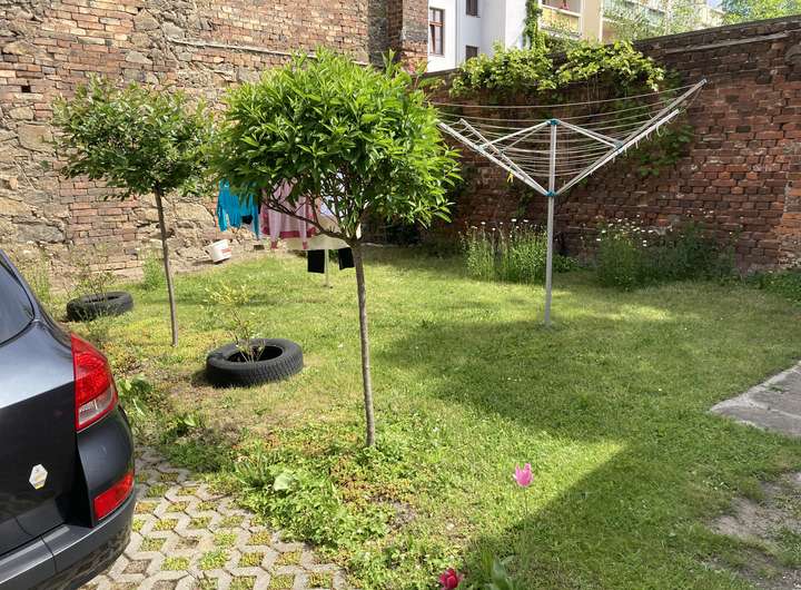 Wäsche kann auf dem Wäscheplatz im Hinterhof oder auf dem Wäscheboden aufgehängt werden.