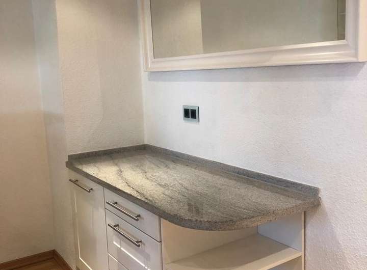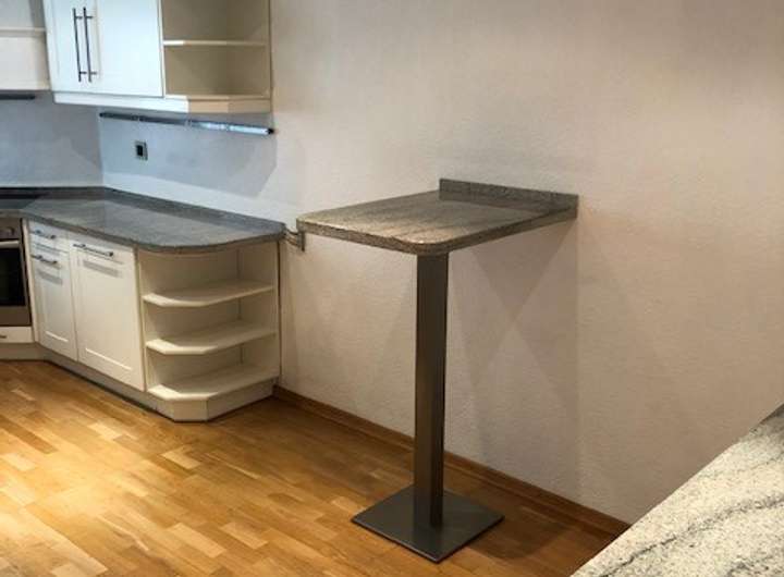das Obergeschoss ist mit einer stilvollen weissen Küche mit Granitarbeitsplatte und Miele Elektrogeräten ausgestattet. Auch ein Bartisch aus Granit zum kurzen Frühstück in der Küche ist vorhanden.