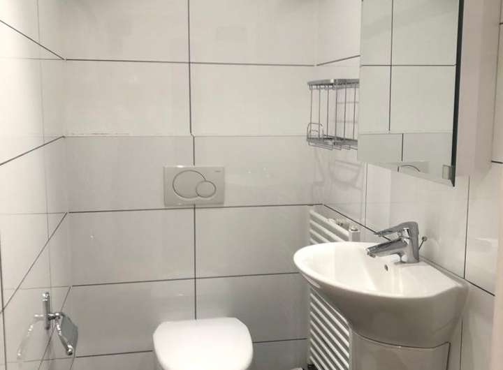 Das OG verfügt über ein modernes weiss gefliesstes Gäste WC mit Spiegelschrank.