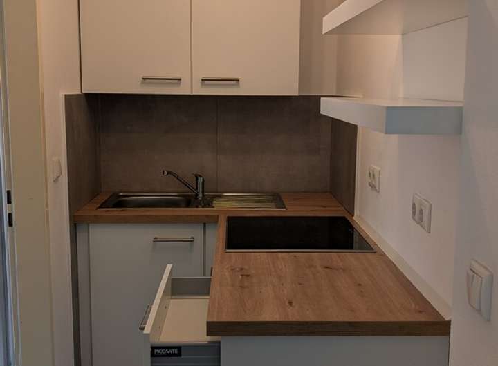 Sie besteht aus einem großen Wohnzimmer mit angrenzender, kleiner Küchenecke mit Einbauküche, einem Schlafzimmer und einem Tageslichtbad mit Dusche.