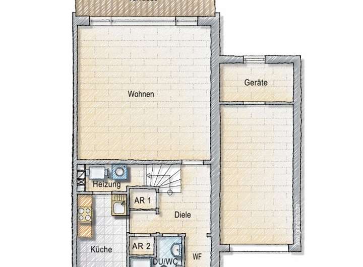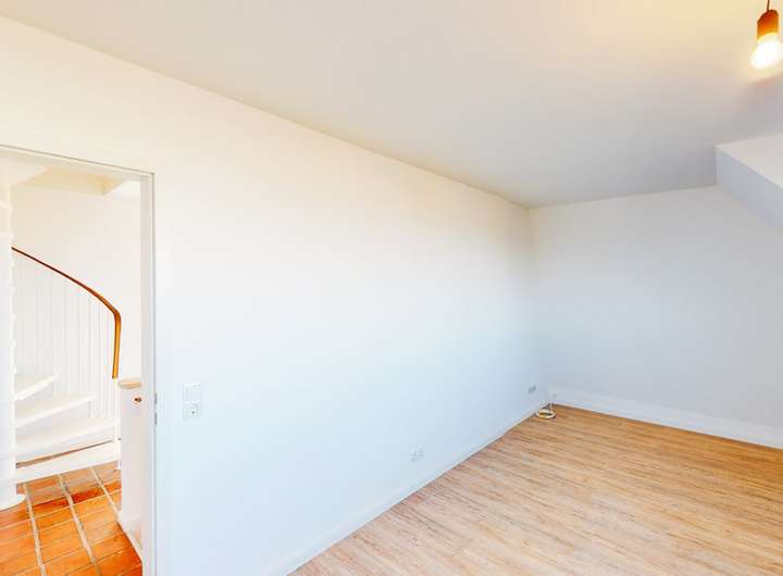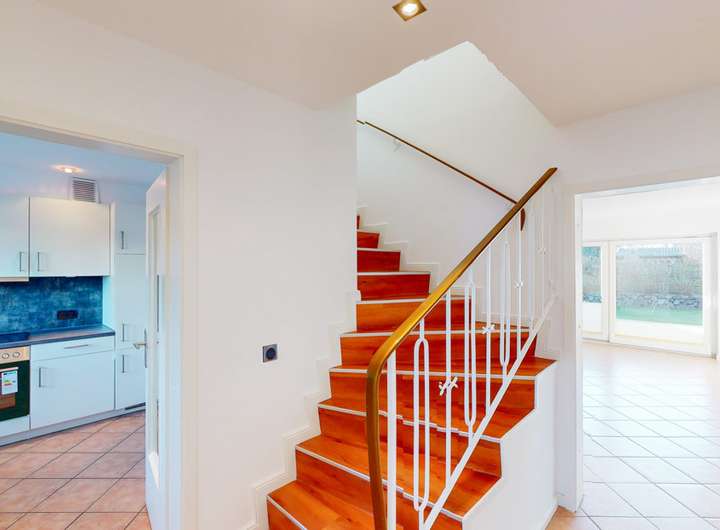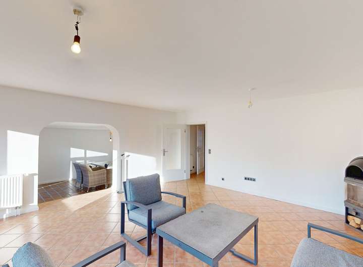 Der Eingangsbereich wird erweitert durch ein angrenzendes Gäste-WC. Das großzügige Wohnzimmer auf der Hauptetage beeindruckt durch seine Helligkeit und bietet ausreichend Platz für gesellige Abende oder entspannte Stunden am Kamin.