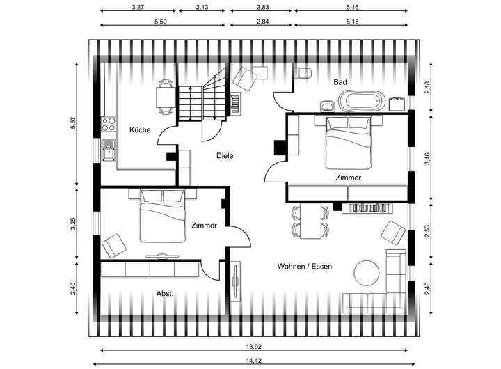 Sie betreten die circa 115 qm große Wohnung über eine kleine Eingangsdiele, von der alle Zimmer, wie Küche, Wohn- und Essbereich, Bad und beide Schlafräume, zu erreichen sind. An ein Schlafzimmer grenzt ein Abstellraum, der ohne weiteres als Ankleidezimmer genutzt werden kann. Die Küche ist mit einer Einbauküche ausgestattet. Die Fußböden sind gefliest oder mit Laminat versehen, die Wände verputzt und gestrichen und die Dachfenster sind mit Außenrolläden versehen.