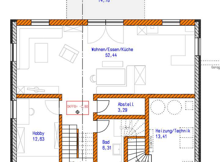 Über eine Breite Treppe erfolgt der Zugang ins Souterrain. Dort befindet sich ein Büro oder Gästezimmer, ein geräumiges WC sowie das Highlight der Wohnung, der offene Wohnbereich mit ca. 60 qm und eleganter Einbauküche mit hochwertigen Markengeräten.