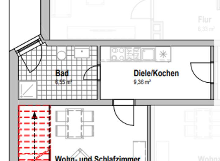 Das Apartment selbst besticht durch lichtdurchflutete Räume und eine durchdachte Aufteilung. Der kombinierte Wohn- und Kochbereich mit ca. 23 m² bietet ein offenes, wohnliches Ambiente.