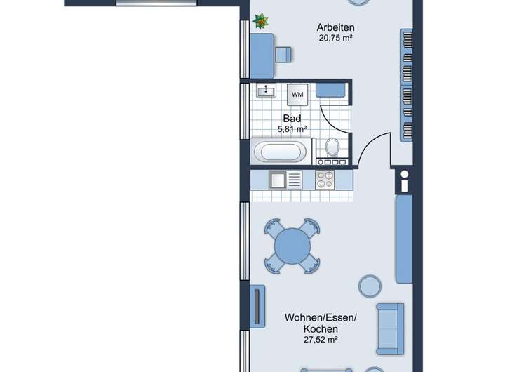 Ein Schlafzimmer sowie ein praktischer begehbarer Kleiderschrank bieten ausreichend Stauraum und tragen zur funktionalen Aufteilung bei. Die Küche ist bereits im Mietpreis enthalten, sodass Sie sich direkt einleben können. Besonders hervorzuheben ist die Terrasse mit einer großzügigen Fläche von ca. 14 m², die Ihnen zusätzlichen Freiraum im Freien bietet.