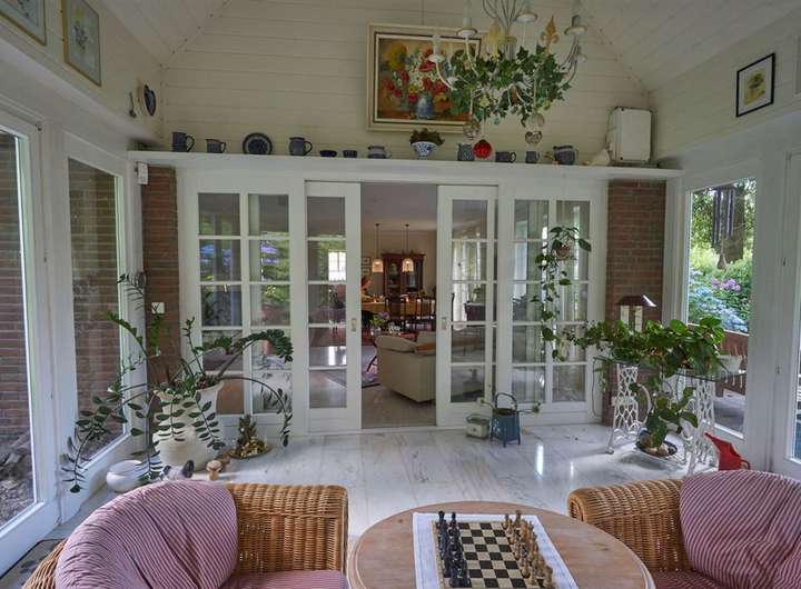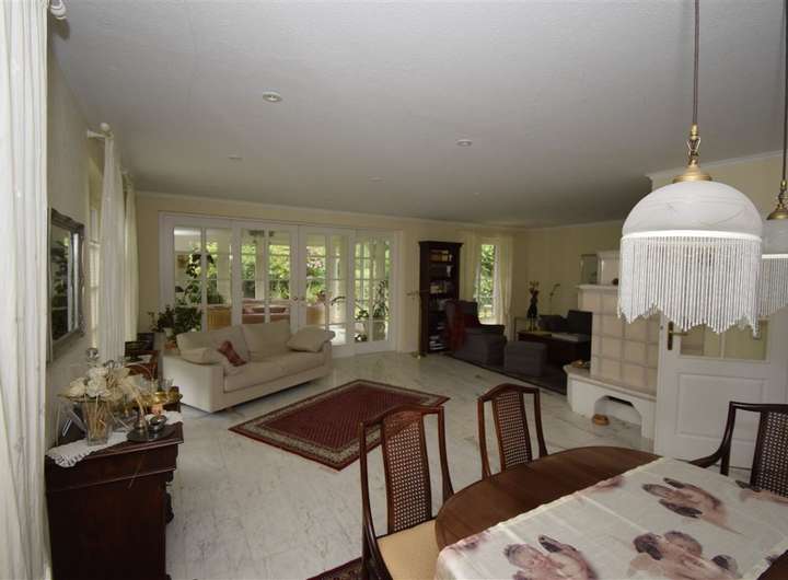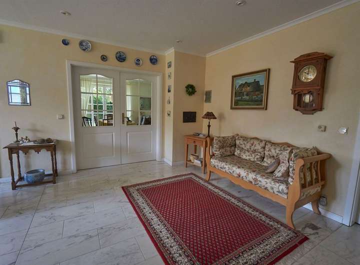 Großzügige Eingangsdiele, 43 m² Wohnzimmer mit Kaminofen und Zugang zum großen Wintergarten,