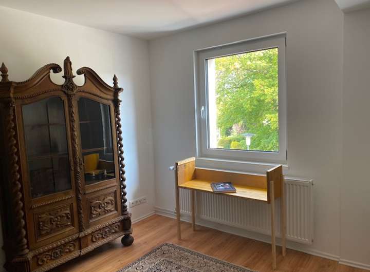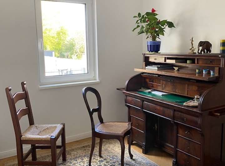 Erdgeschoss: Wohnzimmer, Arbeitszimmer, Diele, Gäste-WC mit Dusche, West-Terrasse