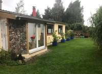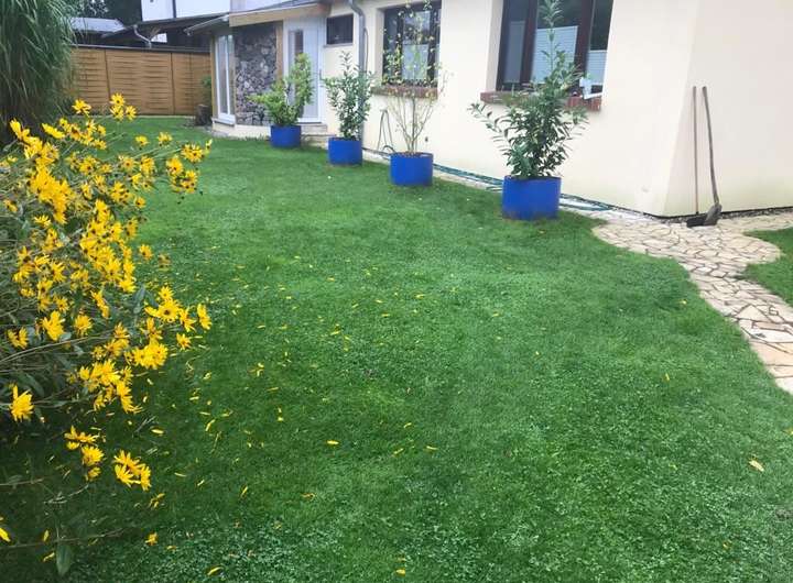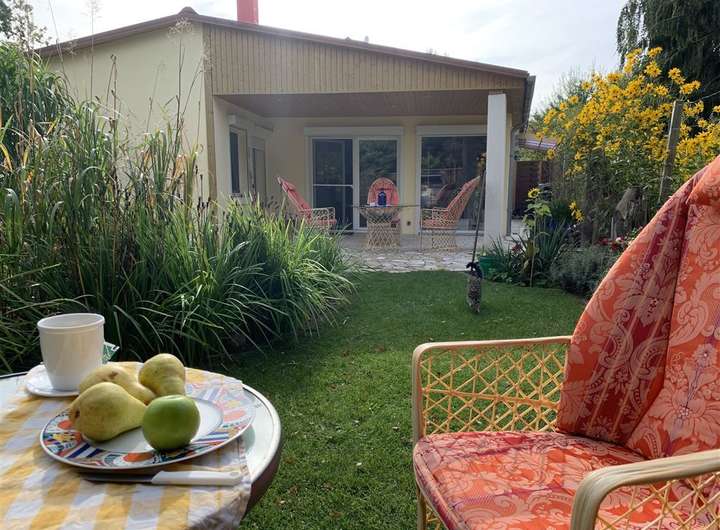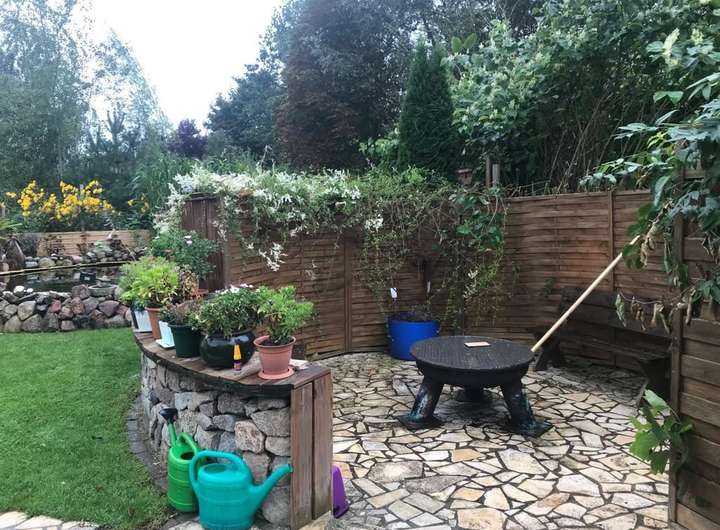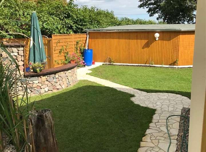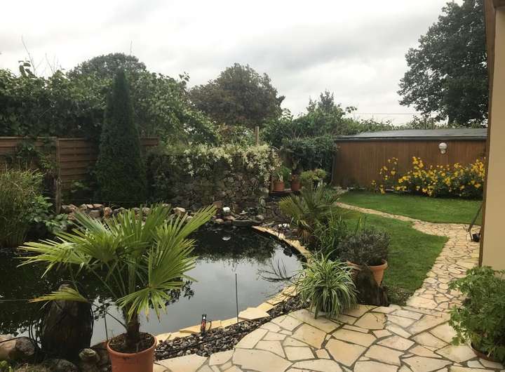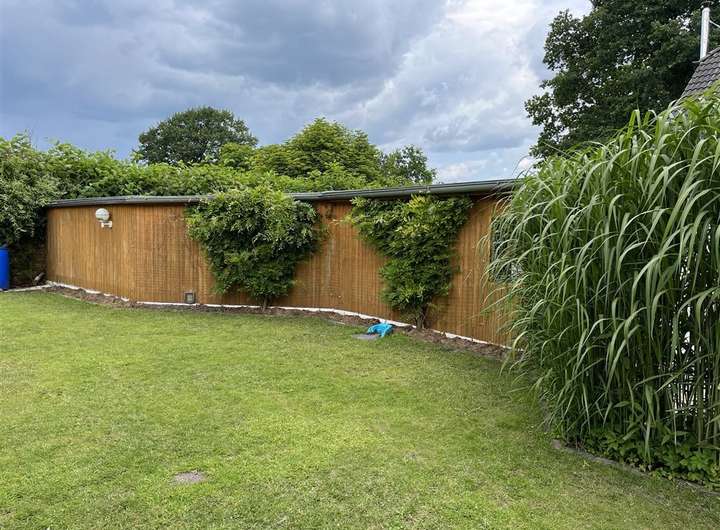 Das Wohnzimmer verfügt über bodentiefe Fenster, welche auf die überdachte Terrasse und in den sehr schön angelegten Garten führen. Der Garten ist pflegeleicht mit Teich und Natursteinen angelegt und ist mit einem Holzzaun zu den Nachbarn eingefriedet. Hier können Sie sich jederzeit vom Alltag erholen.
