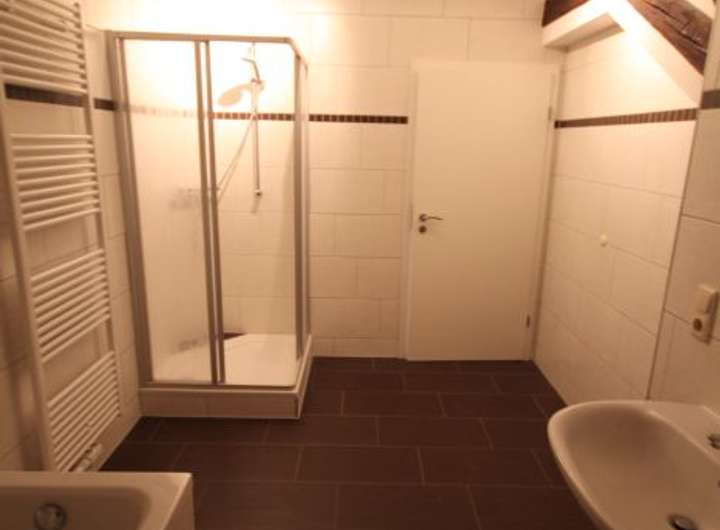 - modernes Bad mit Wanne und Dusche sowie Waschmaschinenanschluss