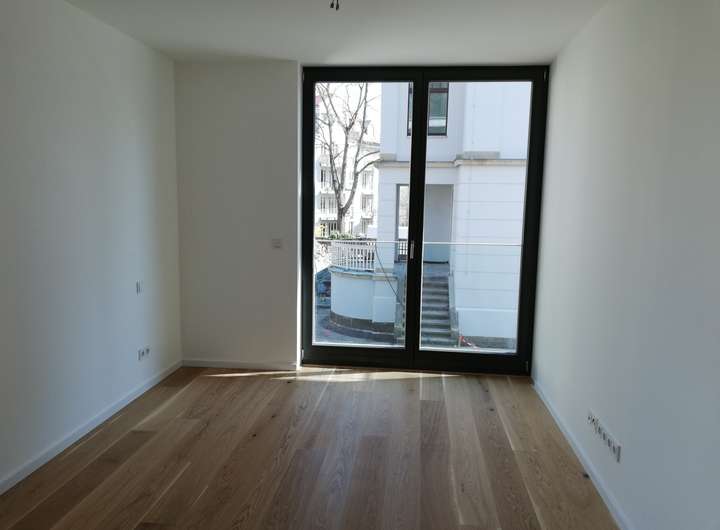 Bei der Planung und Anordnung der Küche wurde darauf Rücksicht genommen, dass sowohl die Anhänger der offenen "amerikanischen Küche", wie auch Liebhaber eines separaten Küchenbereichs gleichermaßen auf ihre Kosten kommen werden. In dem Wohnungsgrundriss ist die Küche mit dem Wohnzimmer verbunden, jedoch nicht direkt einsehbar. Auf Wunsch besteht auch hier die Möglichkeit, die Küche komplett abzutrennen. Alle Räume sind mit Parkettfußboden ausgestattet und werden schwellenlos ausgeführt. Die Fenster zur Straße haben eine Lärmschutzverglasung.