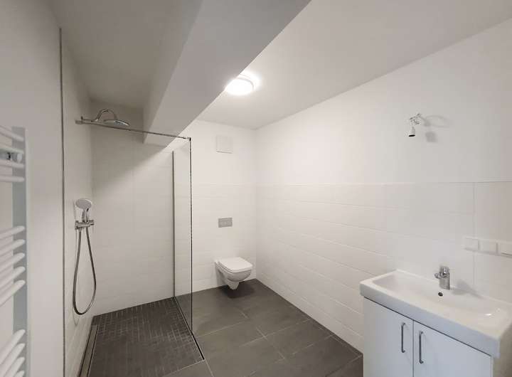 - Anthrazite Boden- und weiße Wandfliesen im Bad
