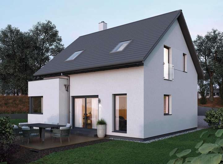 Bei ELK wird Vielfalt groß geschrieben: Ob bei Dachform, Fassadengestaltung, Balkon oder Terrassenüberdachung - das ELK - Haus ist wandlungsfähig. Flachdach, Walmdach, Satteldach oder Pultdach verleihen ihm jeweils einen ganz eigenen Charme, ebenso die Fassadengestaltungsmöglichkeiten. Große Fensterflächen sorgen für eine lichtdurchflutete, moderne Atmosphäre, während die große Schiebetür direkt auf die Terrasse führt.