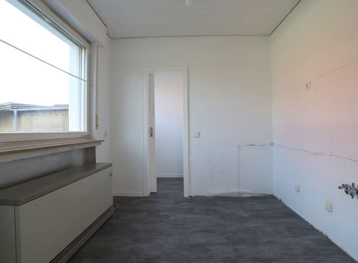 Die ebenfalls helle Küche bietet Platz für eine 1-zeilige Kücheneinrichtung und verfügt über eine praktische Speisekammer. Direkt vor der Küche befindet sich das Esszimmer mit Zugang zum Wintergarten.