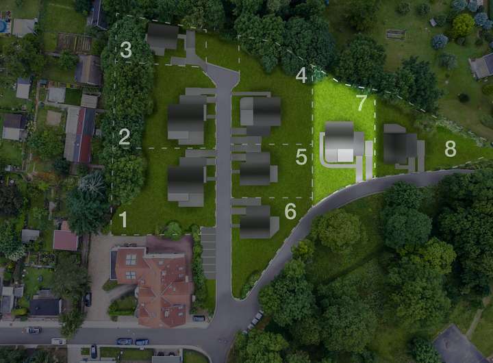 Das voll erschlossene Baugrundstück ist insgesamt ca. 7.000 m² groß und wurde bereits in 8 einzelne Grundstücke unterteilt.
