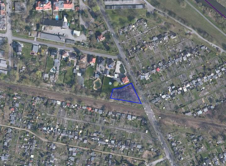 Unbebautes Eckgrundstück in einem von straßenbegleitendem Grün geprägten Wohngebiet. Das Flurstück ist überwiegend mit Bäumen und Sträuchern bewachsen und befindet sich in der Nähe von Bahngleisen. Lage im Innenbereich gem. §34 BauGB. Im gültigen FNP Ausweisung als Wohnbaufläche. Im laufenden Änderungs- /Neuverfahren Darstellung als gemischte Baufläche. Lage im Bereich einer Kampfmittelverdachtsfläche