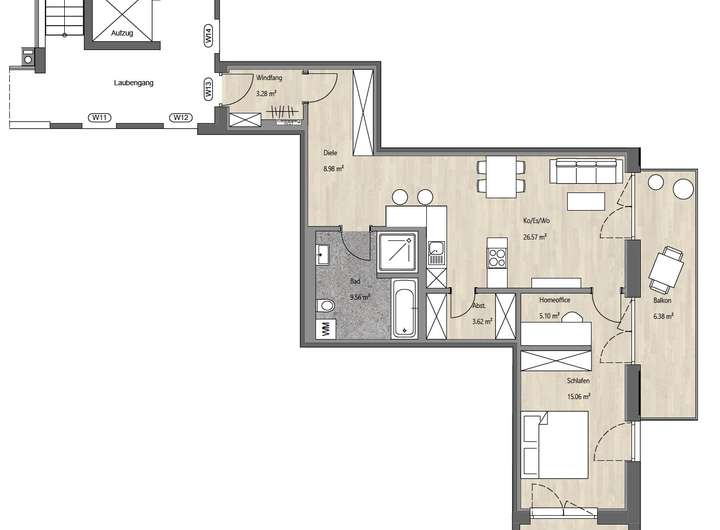 Whg 13 - Zweizimmerwohnung mit Südbalkon und Westterrasse