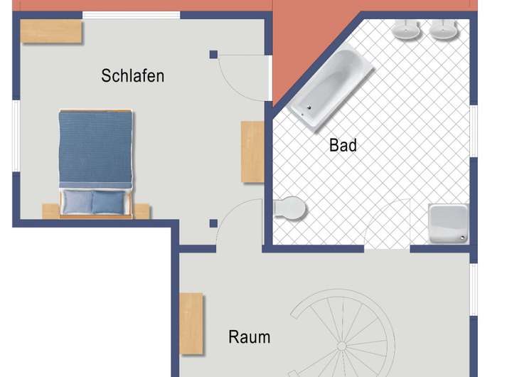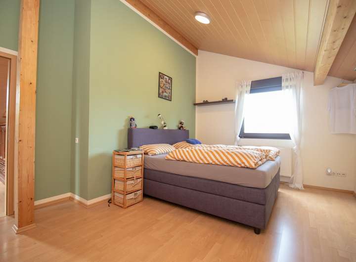 Links befindet sich das gemütliche Schlafzimmer, rechts das moderne Tageslicht-Duschbad und eine Abstellkammer (mit Fenster).