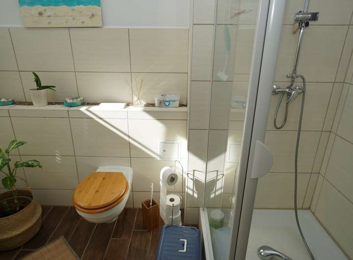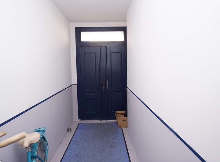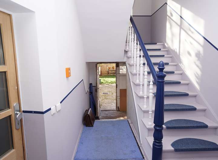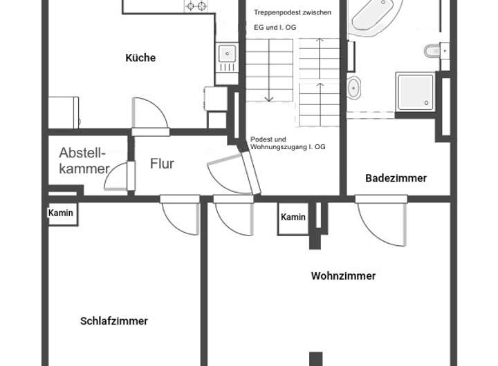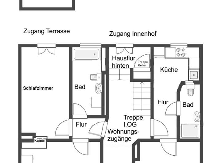 Von der Straße aus führt ein Hausflur bis zum Ausgang in den Innenhof. Rechts und links vom Hausflur liegen die beiden im Erdgeschoss befindlichen Einraumwohnungen. Die Wohnung links hat eine Wohnfläche von ca. 26 m² und unterteilt sich in eine Küche, ein Bad mit Dusche und WC und ein Wohn- und Schlafraum. Die Fußböden sind mit Dielen belegt. Das Bad ist gefliest. Die Wohnung rechts hat eine Größe von ca. 39 m². Sie besteht aus einem Flur, einer Wohnküche, einem Schlafraum mit direktem Zugang in den Innenhof, mit kleiner Sitzecke. Die Wohnung verfügt auch über einen separaten Kaminofen als zusätzlicher Heizquelle und ein Bad mit Wanne, WC und Waschbecken. Die Raumhöhe in der Geschossebene beträgt ca. 2,90 m.