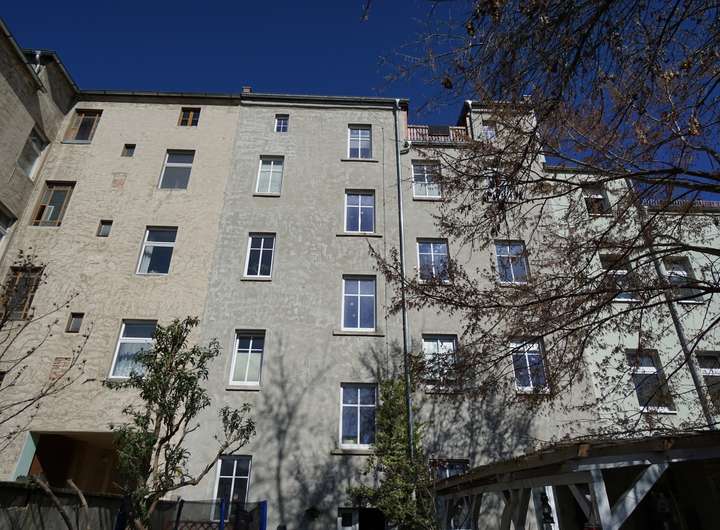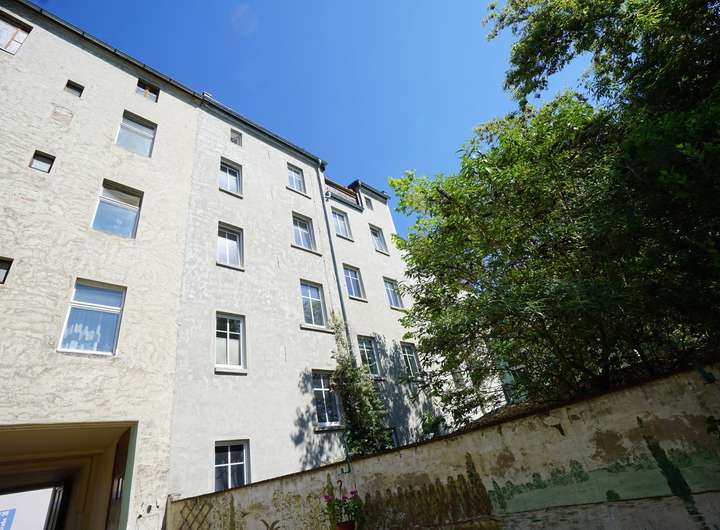 Objekt: Das Grundstück ist mit einem massiven viergeschossigen Mehrfamilienhaus bebaut. Auf dem Innenhof steht ein kleines Nebengebäude mit Vordach, das als Abstellfläche dient.