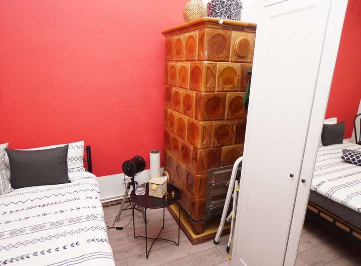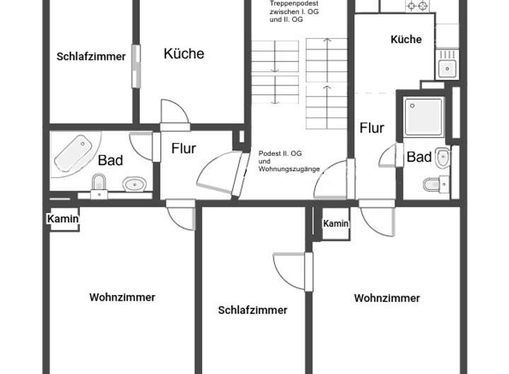 Im II. Obergeschoss ist die Fläche in eine links und eine rechts liegende Zweiraumwohnung aufgeteilt. Die linke Zweiraumwohnung hat eine Wohnfläche von ca. 40 m² mit einer Küche, mit einem Duschbad, sowie einem Wohn- und einem Schlafraum. Die rechte Zweiraumwohnung mit Ihren ebenfalls ca. 40 m² Wohnfläche besitzt ein großes Wohnzimmer, ein kleines Schlafzimmer und eine kleine Küche. Weiterhin besitzt sie einen kleinen Flur und ein Wannenbad mit WC und Waschbecken. Die Raumhöhe dieser Etage liegt ebenfalls bei 2,80 m. Auch hier stehen in den Wohnungen Kaminöfen zur Verfügung. Die Fußböden haben Dielen bzw. die Bäder sind gefliest.