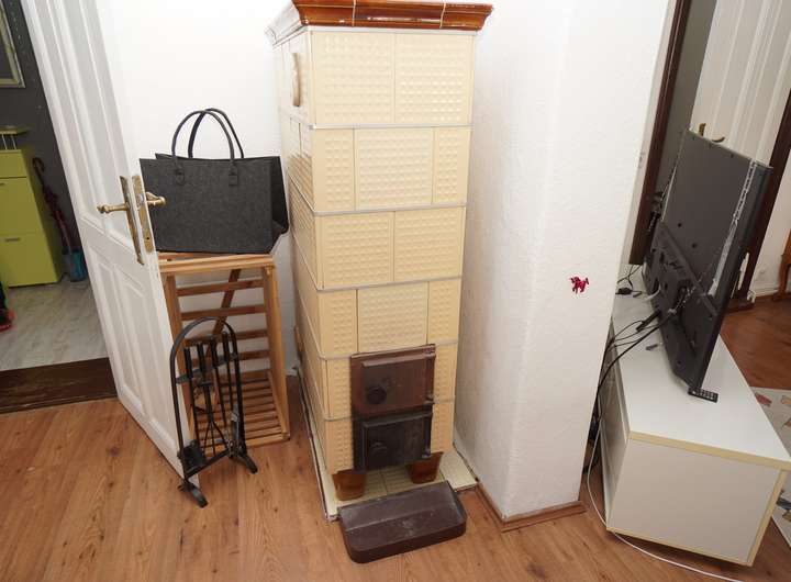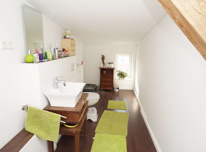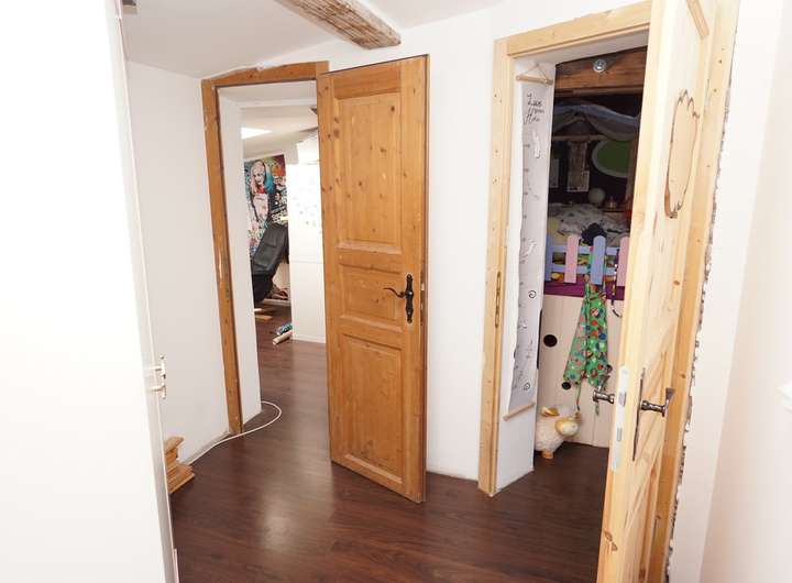 Das I. Obergeschoss wird über eine Holztreppe erreicht, die weiter bis ins Dachgeschoss verläuft. Im I. Obergeschoss ist eine große Wohnung angeordnet, die rechts vom Hausflur aus begangen werden kann. Sie hate eine Wohnfläche von ca. 76 m² und verfügt über einen Flur, zwei große Wohn- oder Schlafräume, einen Abstellraum, ein Wannenbad mit Dusche WC und Waschtisch und eine große Küche. Die Raumhöhe beträgt in dieser Etage 2,80 m. Die Böden sind mit Dielen ausgestattet das Bad ist gefliest. Es stehen neben der Zentralheizung zwei Kachelöfen zur Verfügung.