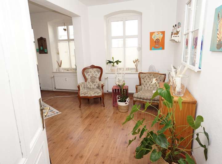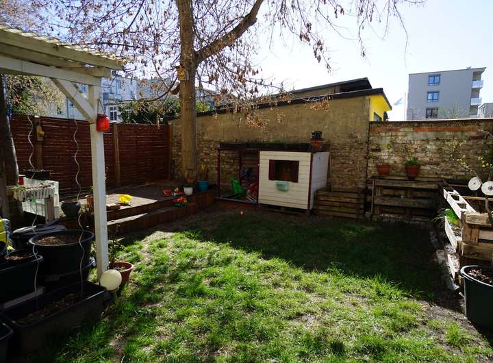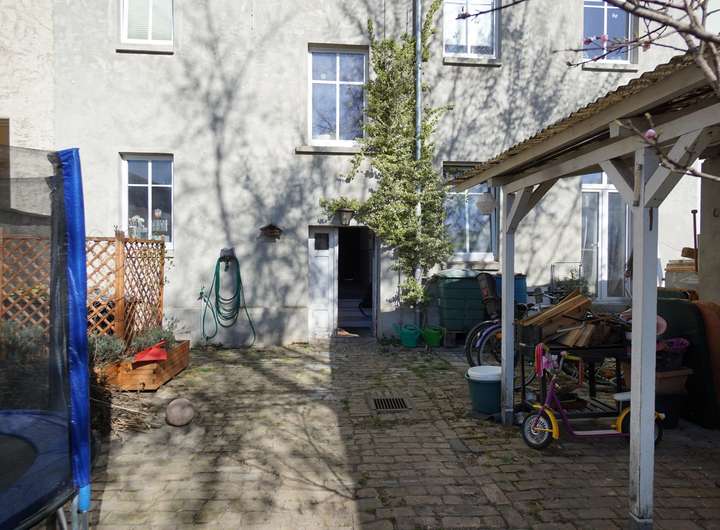 Größe: Die Größe des Grundstücks beträgt ca. 252 m². Es hat eine Straßenfront von ca. 11 m. Am hinteren Ende sind es ca. 9 m. Es hat eine Tiefe von ca. 25 m. Auf dem kleinen Innenhof ca. 140 m² groß, steht noch ein kleiner ehemaliger Stall mit einem Vordach, der als Abstell- und Sitzfläche genutzt wird. Ebenso gibt es zwei weitere Sitzbereiche, einer im hinteren Bereich des Grundstücks auf einem Holzpodest, überschattet mit einem sehr schönen großen Ahornbaum und einen weiterer Sitzplatz mit direktem Zugang von der Erdgeschosswohnung aus. Der Hof ist im vorderen Bereich teilweise mit typischen märkischen Klinkern belegt. Der hintere Teil ist begrünt. Der Zugang zum Hof erfolgt über das Treppenhaus im EG. Das Hofgelände ist eingezäunt bzw. mit Mauern zu den Nachbargrundstücken abgeschirmt.