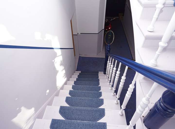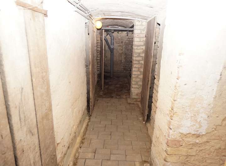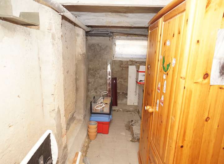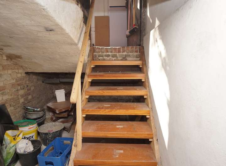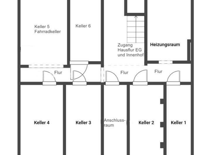 Am hinteren Ende des Hausflurs im Erdgeschoss führt eine Holztreppe in den Kellerbereich. Der Keller mit seiner ca. 79 m² großen Nettogrundfläche besteht aus 8 Räumen, dem Zugang zum Hausflur und dem Kellergang. Von den 8 Kellerräumen dienen 5 als Abstellflächen für die Mieter, einer als Heizungsraum in der die Therme installiert ist und einer ist der Hausanschlussraum, der alle Zuleitungen der Medien von der Straße aufnimmt. Im hinteren Bereich liegt noch ein offener Raum zum Abstellen von Fahrrädern. Die Fußböden sind mit Ziegelsteinen ausgelegt bzw. mit Betonsteinen belegt.
