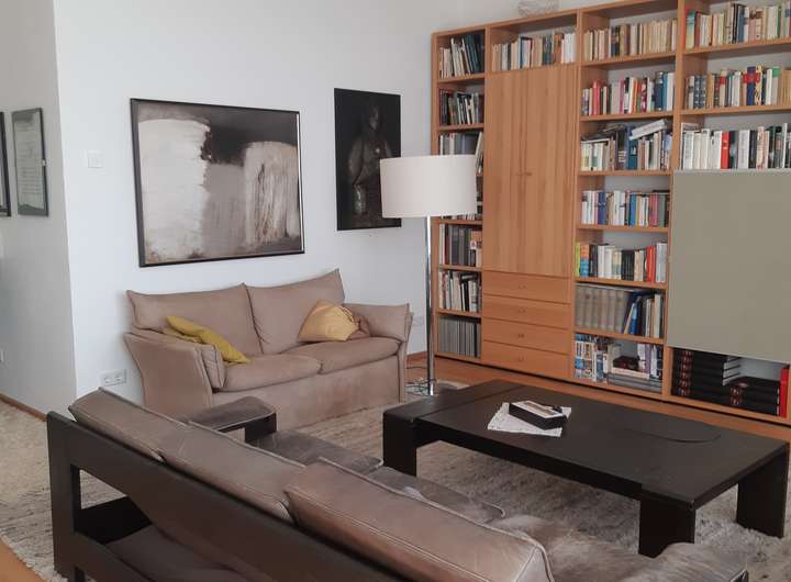 Die Einbauküche, das hochwertige Einbauregal sowie die moderne Deckenlampe im Wohnzimmer sind im Mietpreis enthalten und passen perfekt zum eleganten Penthouse-Stil