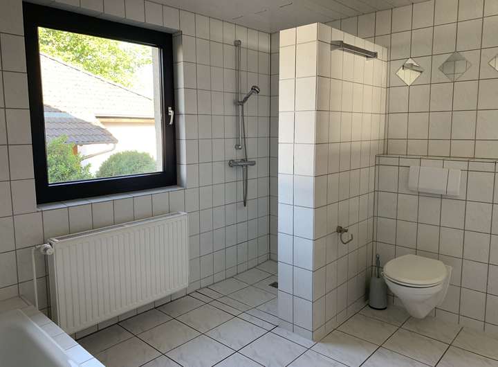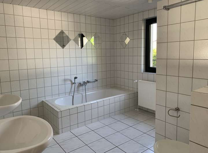 Weiter befinden sich ein Gäste WC und ein großes Hauptbad mit Badewanne, Dusche und zwei Waschbecken im Erdgeschoss. Im Keller gibt es einen gefliesten und beheizbaren Raum, ein Abstell- und ein Durchgangsraum mit Anschluss für die Waschmaschine und der Heizungsraum.