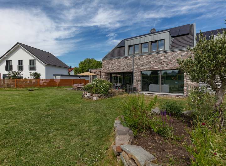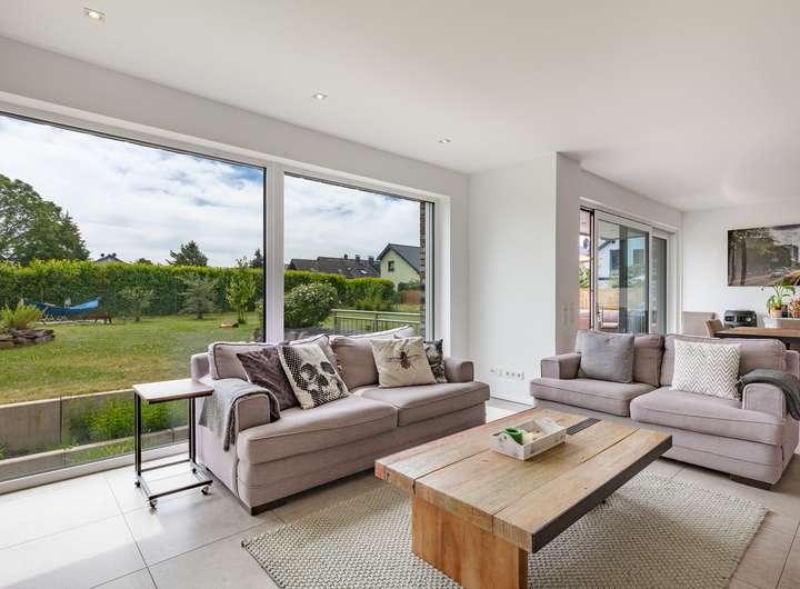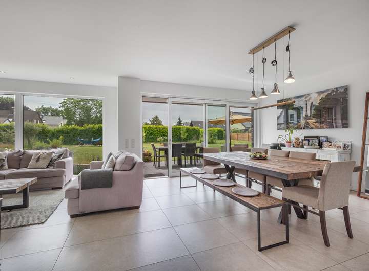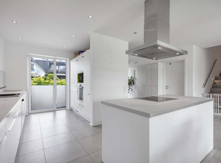 Die moderne, hochwertig errichtete Doppelhaushälfte wurde 2019 fertiggestellt. Bodentiefe Fensterfronten und die offene Raumgestaltung mit integrierter Küche verleihen dem Haus eine helle, einladende Wohnqualität. Der großzügige Wohn- und Essbereich präsentiert sich als Herzstück des Hauses und wird durch die elegante Einbauküche der Marke Häcker Küchen abgerundet. Das gesamte Erdgeschoss sowie die Treppe sind mit großformatigen Feinsteinzeugfliesen (60 × 60 cm) in zeitgemäßer Betonoptik ausgestattet.