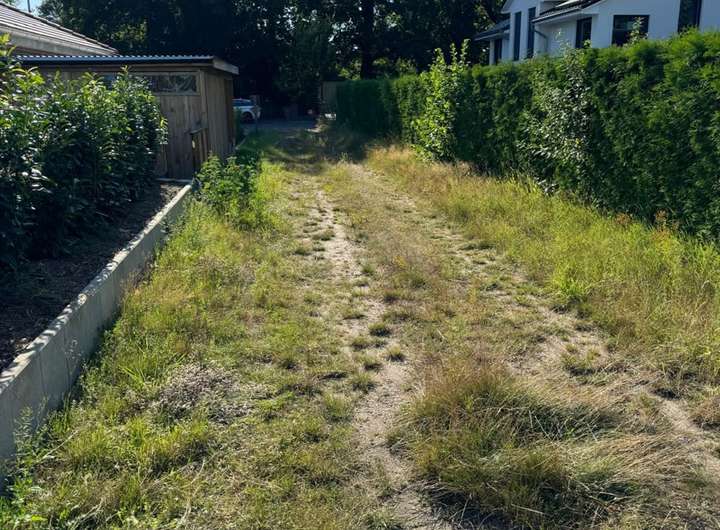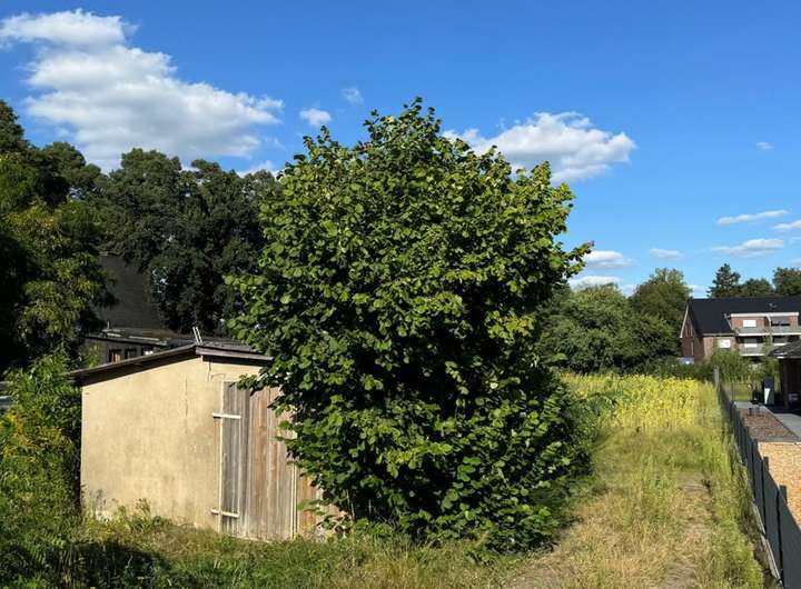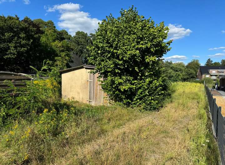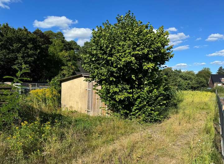 Bebaut werden kann das Grundstück nach umliegender Bebauung (§34 BauGB). Die umliegende Bebauung ist sehr vielfältig. Eine alte Garage für Geräte gibt es schon.