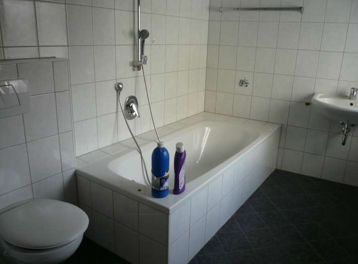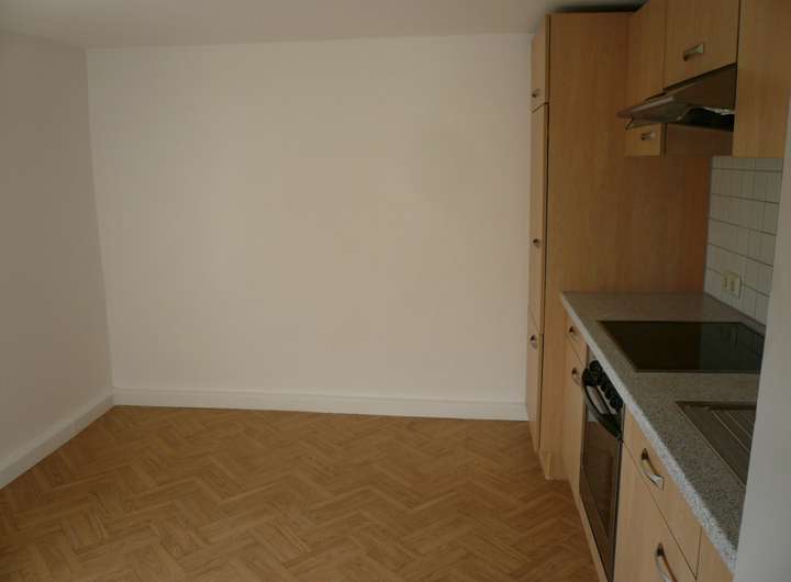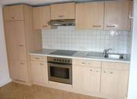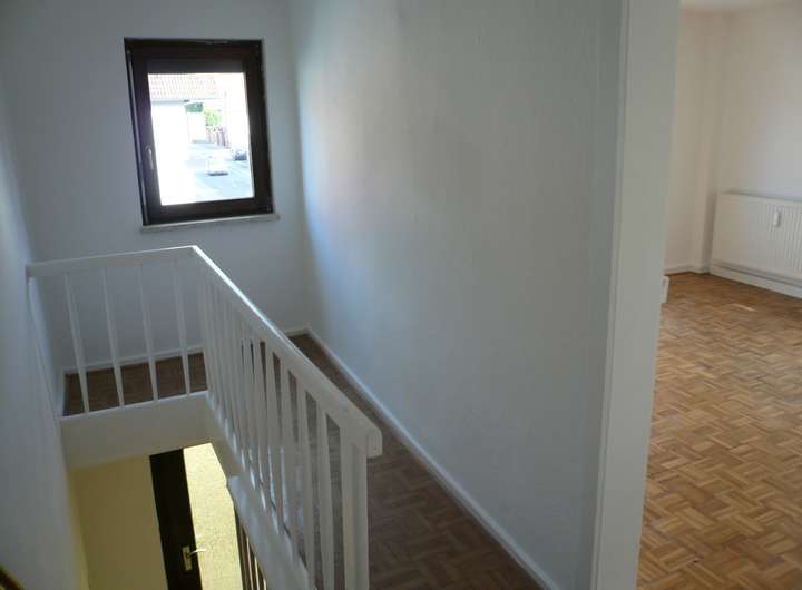Einfamilienhaus mit 4 Zimmer, Küche und Bad. Im Badezimmer ist eine Wanne mit Duschmöglichkeit und einem Fenster. In der Küche befindet sich eine Einbauküche. Die Fußböden sind mit Parkett und Laminat ausgelegt. Die Wände sind mit Raufaser tapeziert und weiß gestrichen.