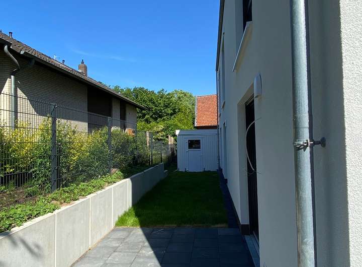 Zu dem Mietobjekt gehören zwei Schlafzimmer, ein Hauptbad, ein Gästebad mit Dusche, ein offener Wohn- und Essbereich, ein Abstellzimmer, eine Küche mit Einbauküche, eine große Terrasse mit kleinem Garten und einem Schuppen sowie ein überdachter Stellplatz.