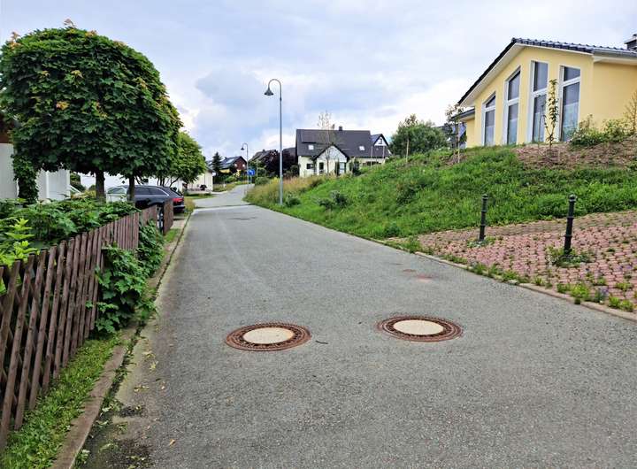 Das Grundstück ist erschlossen sind mit Strom, Telefon, Erdgas, Trinkwasser und je zwei Übergabeschächten für die Regen- und Schmutzwasserentsorgung.