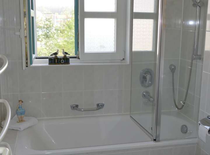 OG: Wannenbad mit Wannenduschtrennwand und Fenster,