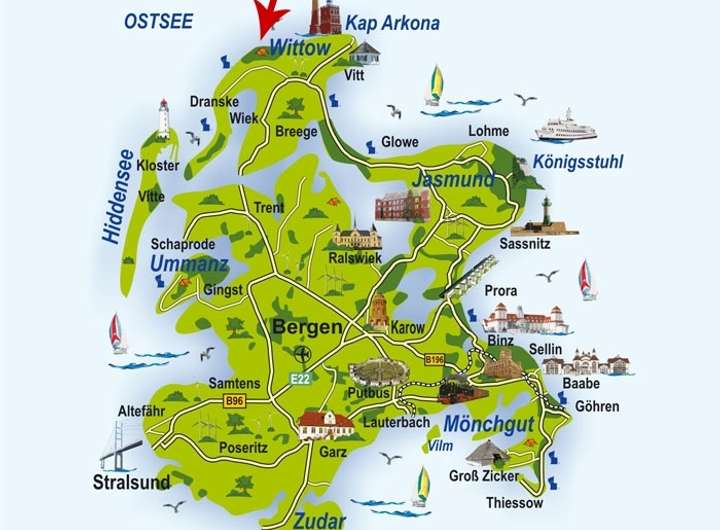 Herrliche Ausflugsziele u.a.: Kap Arkona, das Jagdschloss Granitz, die Ostseebäder Thiessow, Göhren, Baabe, Sellin und Binz mit ihrer faszinierenden Bäderarchitektur, der Jasmunder Nationalpark mit seinem Königsstuhl und den Kreidefelsen.